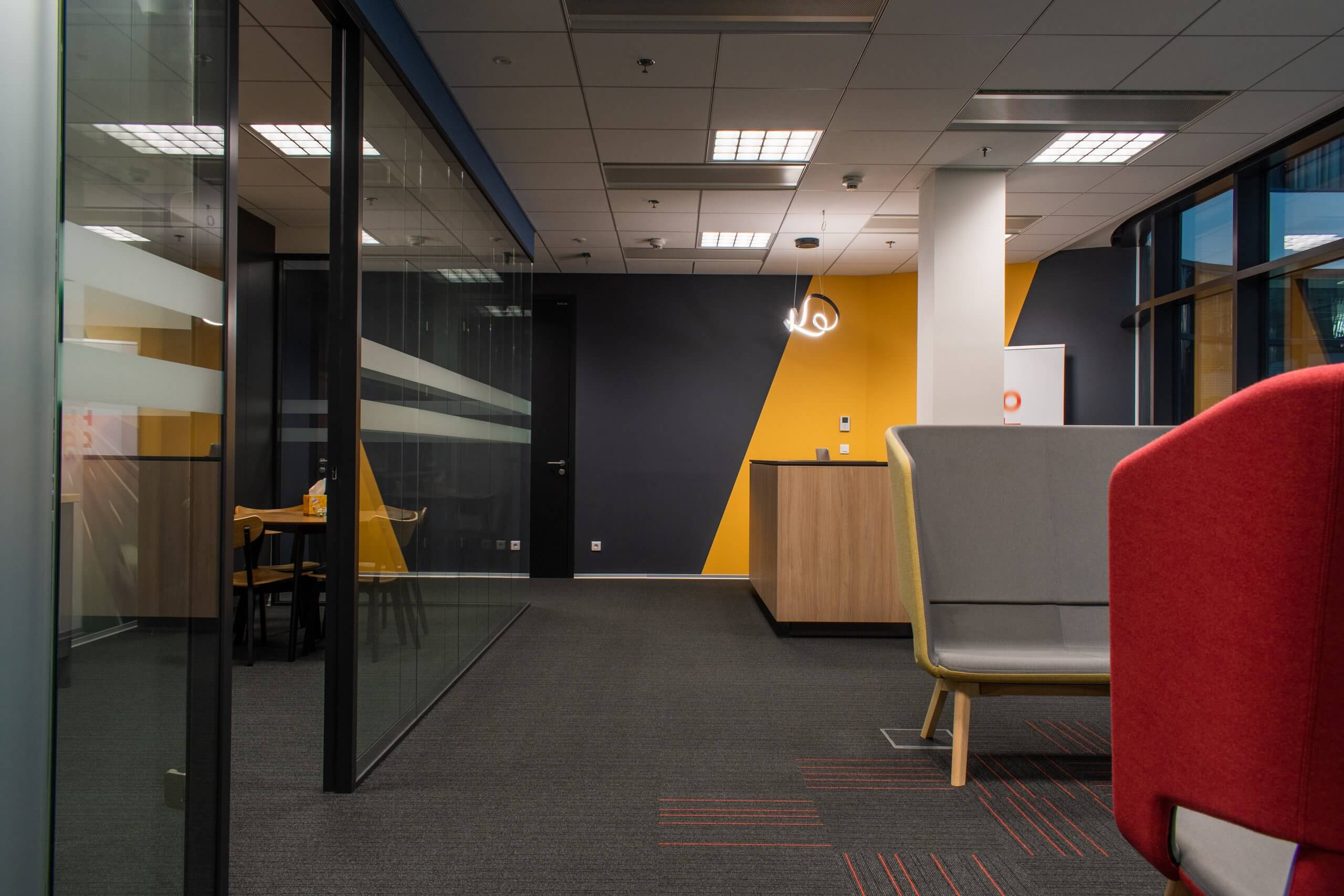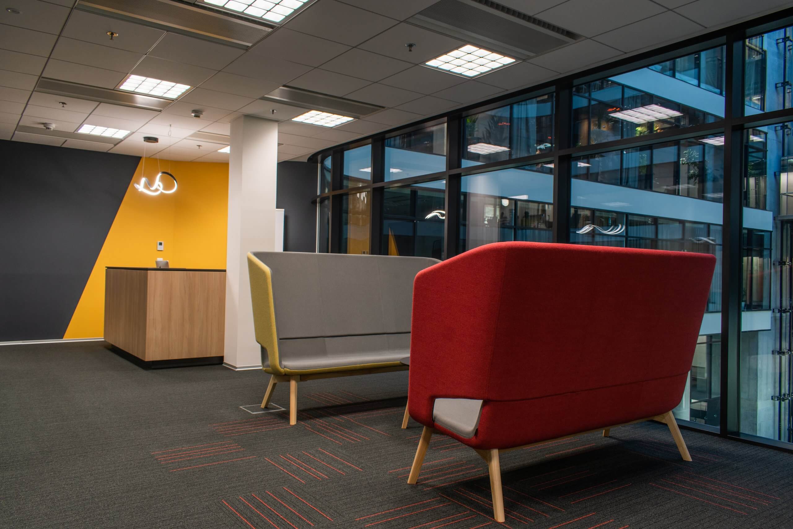 What should a modern car meet? It should be a great combination of usability, design, quality, practicality, comfort and the ability to evoke positive emotions. With the same goal in mind, we set about realising the offices of IMPORTO Drive, a major car dealer. The project itself was developed by the Aspira Business Centre design firm. However, it was up to us to create the colour concept of the interior and to implement everything, including the furniture and accessories. At first glance, one cannot miss the distinctive, enlivening colourful paintwork and the rich hues on the upholstered furniture. These elements also correspond to the automotive character of the client.