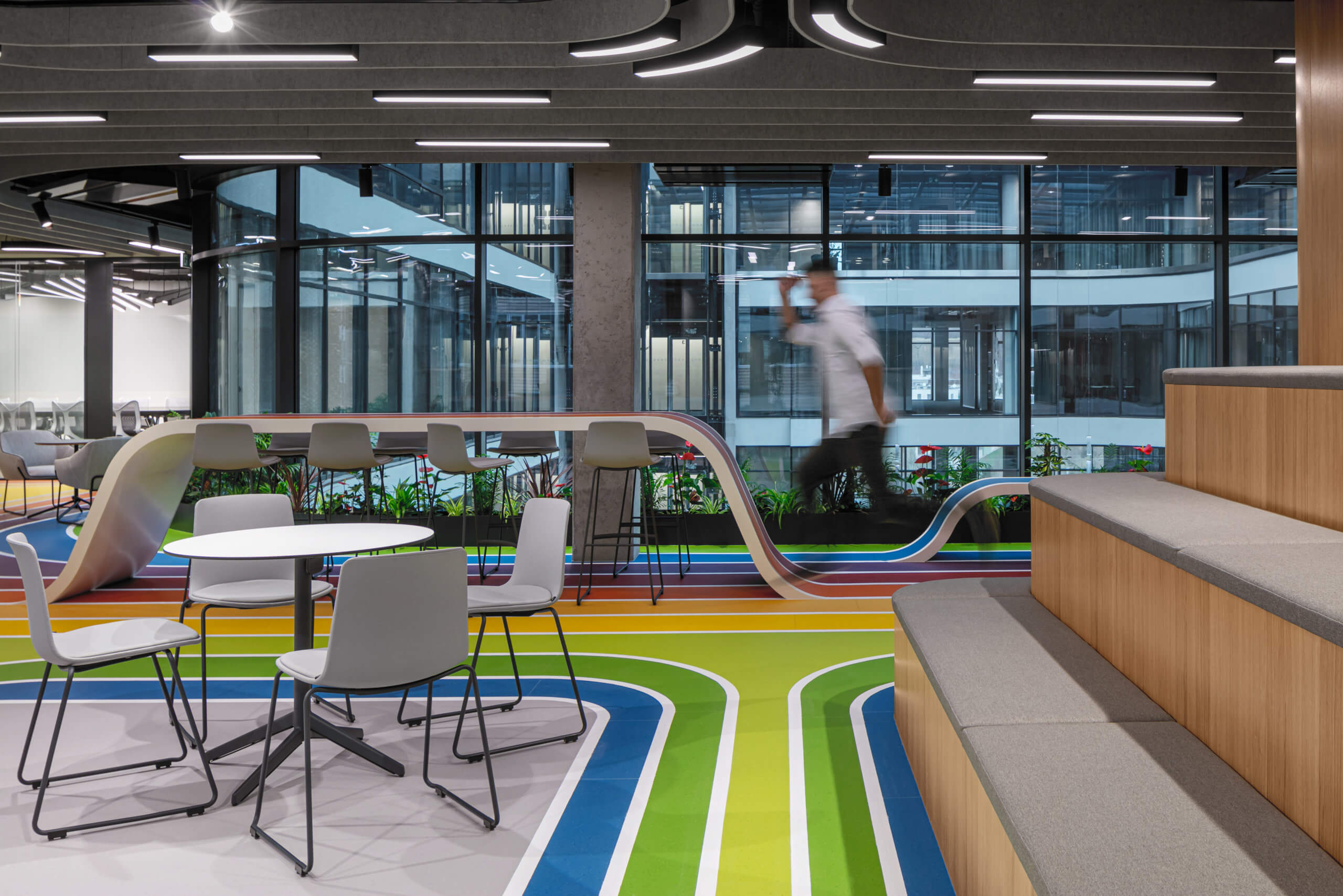 Livesport provides clear sports results to tens of millions of users around the world. In its new offices, the company’s management wanted to clearly express its corporate identity through many playful elements, the most visible of which is located directly under the feet of everyone who enters the office. The floor and furniture feature colors and lines that imitate a running track in a stadium. The floor is made of vinyl strips of different colors with white stripes painted on them, just like in a sports hall. The running track element from the floor then smoothly transitions to the vinyl-covered table and bench. In addition to their creative appearance, the offices also had to be comfortable and promote employee productivity.