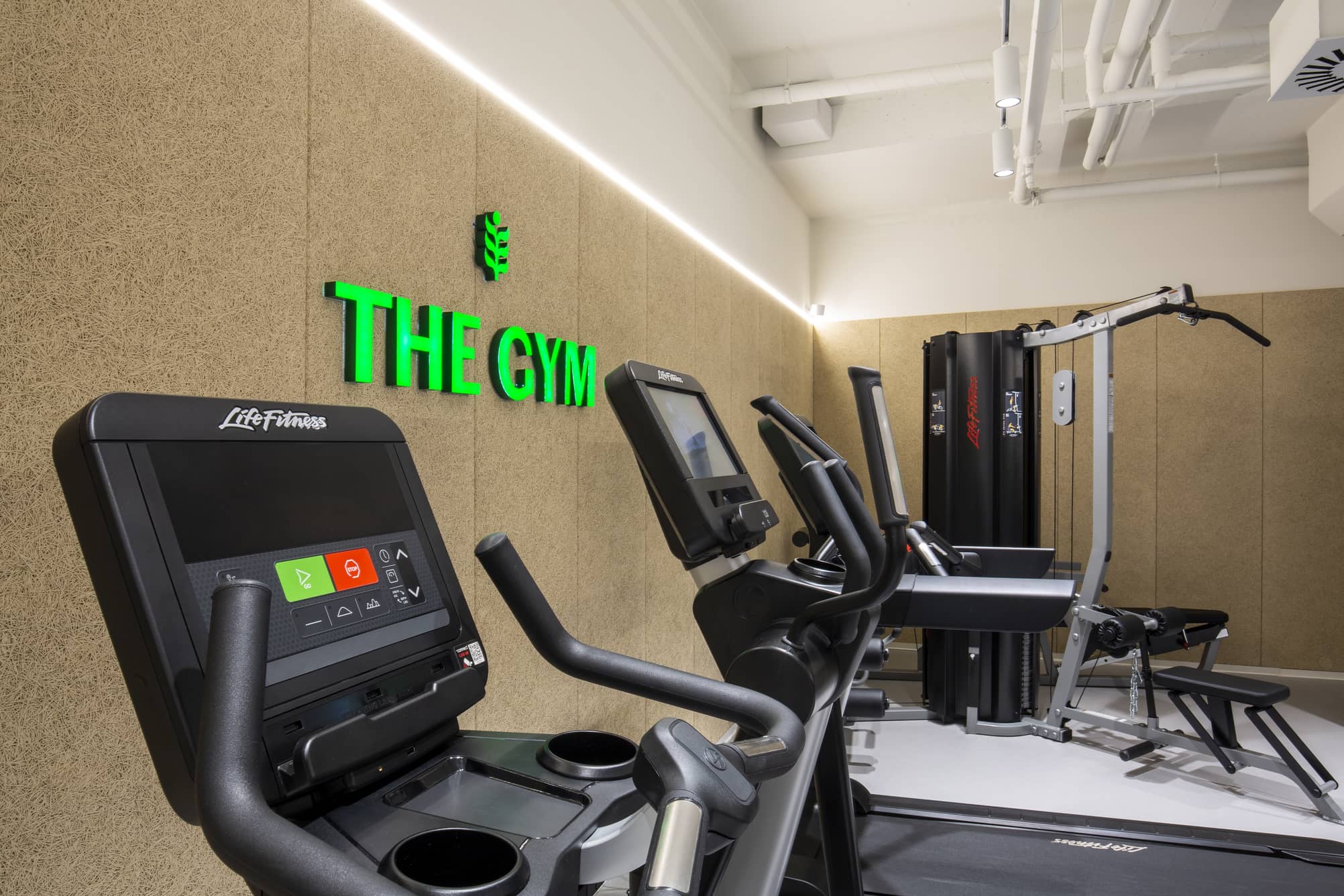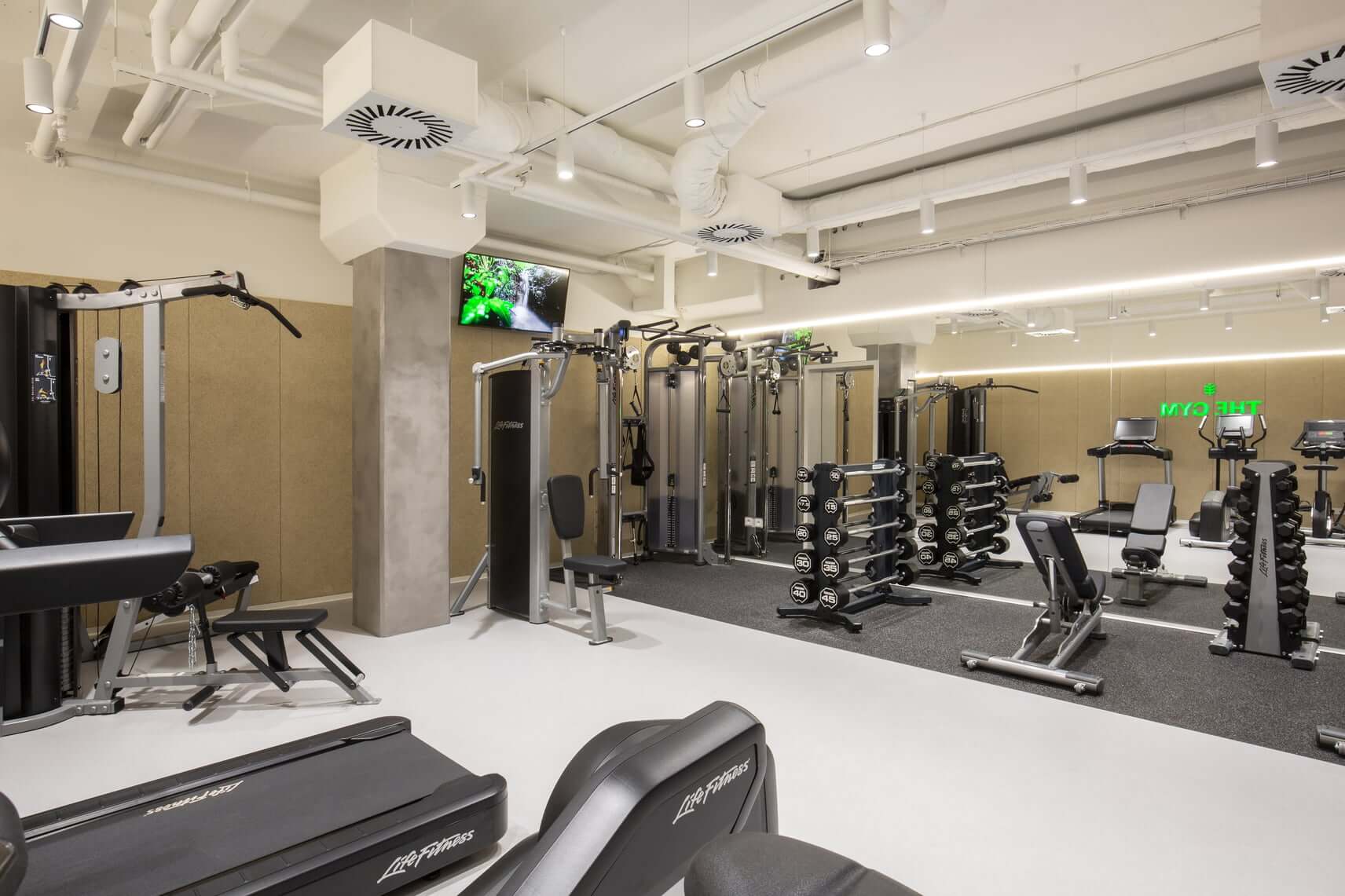 The design of the fitness studio project at Hotel Botanique was taken under the wing of studio Olgoj Chorchoj. The client subsequently approached us to carry out the project. This was a continuation of our previous collaboration where we renovated 75 rooms in the hotel. In the fitness area we carried out structural modifications, installed electrical wiring and modified the existing technological wiring. We laid new vinyl flooring for fitness purposes, added light fixtures and anchored new doors.