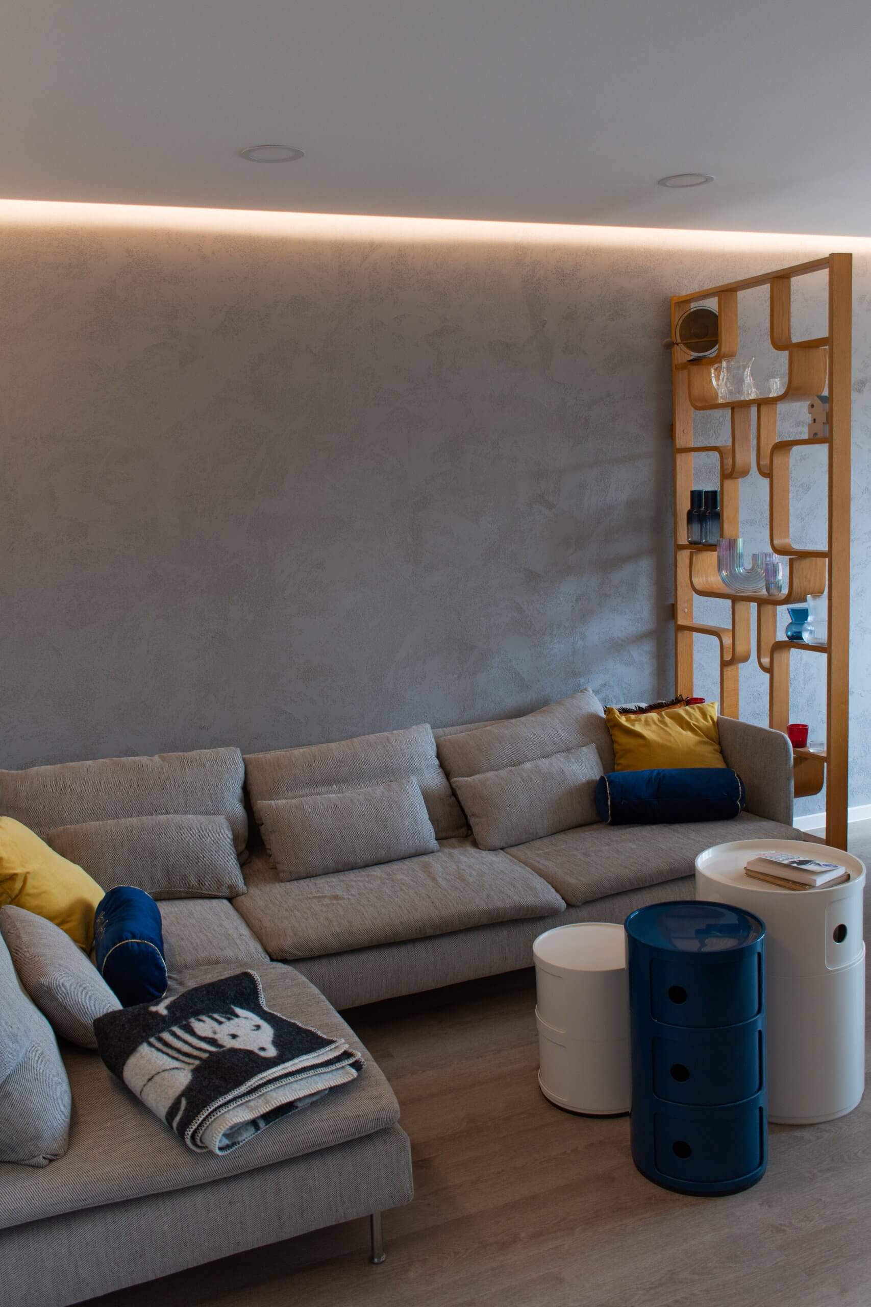 The implementation also included the complete replacement of the existing electrical distribution, the selection and laying of new floor coverings and the color matching of the entire interior. According to the requirements, we chose the dominant white color complemented by wooden furniture decor. We then made the entire space special with blue-yellow-red distinctive accessories, which were chosen based on the client’s color preferences.