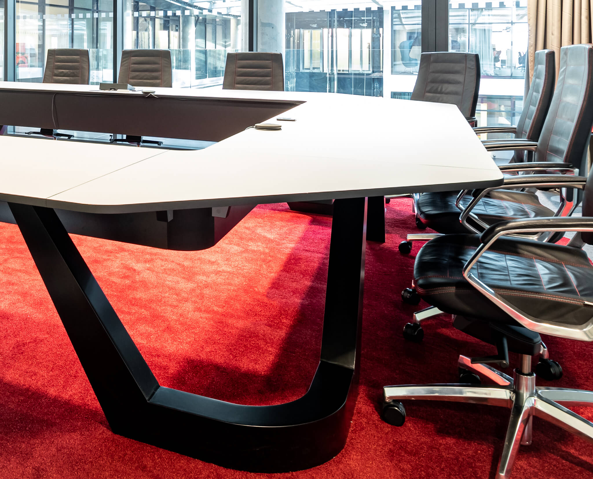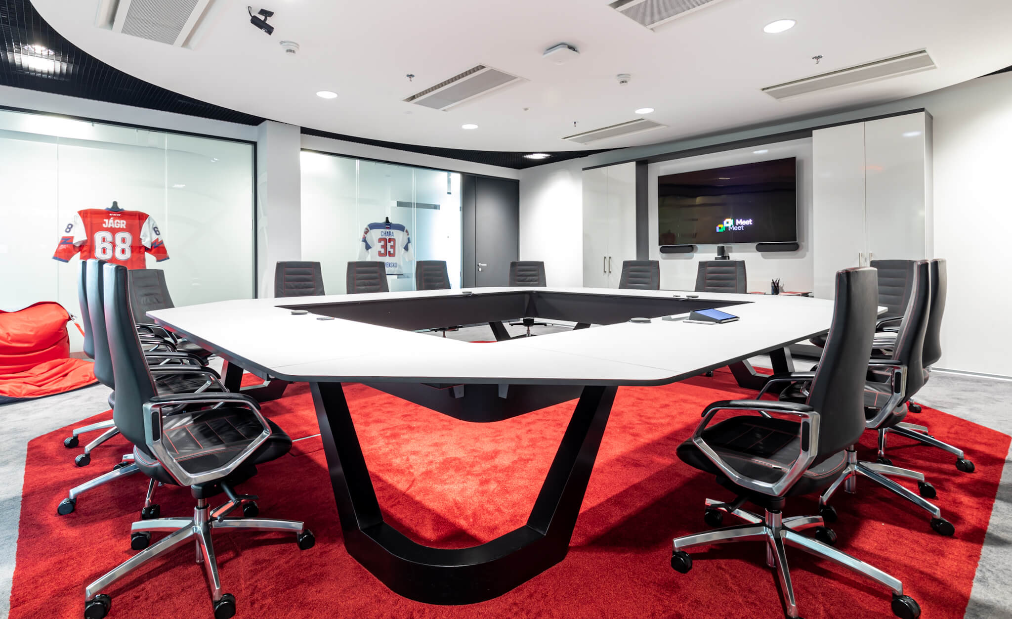 Součástí vybavení zasedací místnosti nebyla jen dodávka nového stolu, ale také vylepšení stávajících akustických podmínek. Pro lepší zvukový vjem jsme využili nový koberec, který svým tvarem kopíruje tvar stolu. Pro ještě větší identifikaci s firemním prostředím jsme zvolili typické barvy, kdy především výrazná červená odráží jednu z hlavních barev společnosti Livesport.