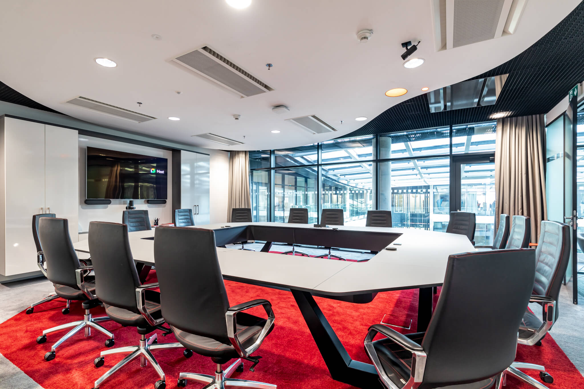 Součástí realizace byl návrh, výroba a dodání atypického zasedacího stolu, který se okamžitě stal dominantou velké zasedací místnosti našeho klienta Livesport. Zároveň jsme do místnosti dodali nový koberec, který pomohl k vylepšení celkové akustiky prostoru.