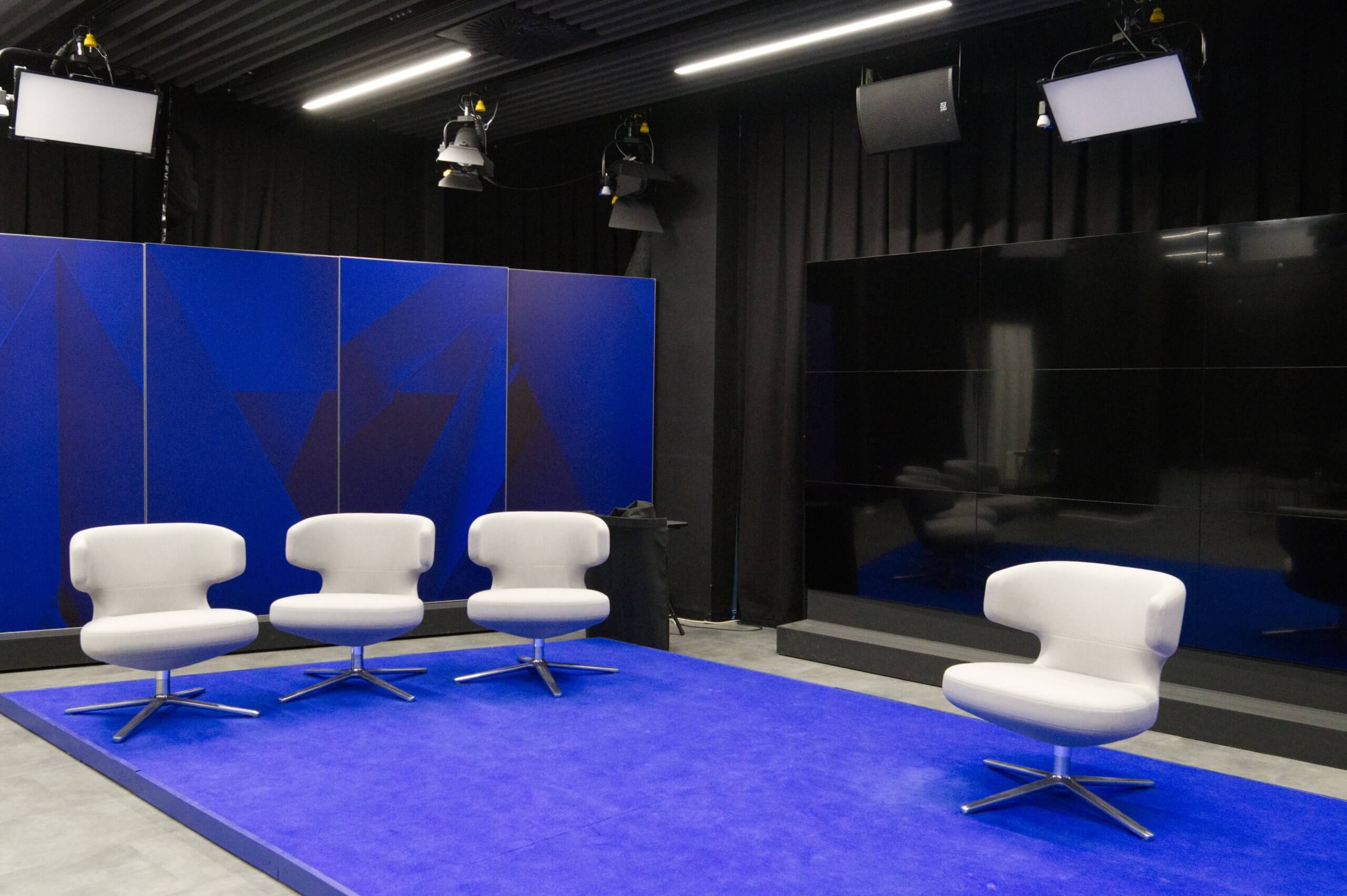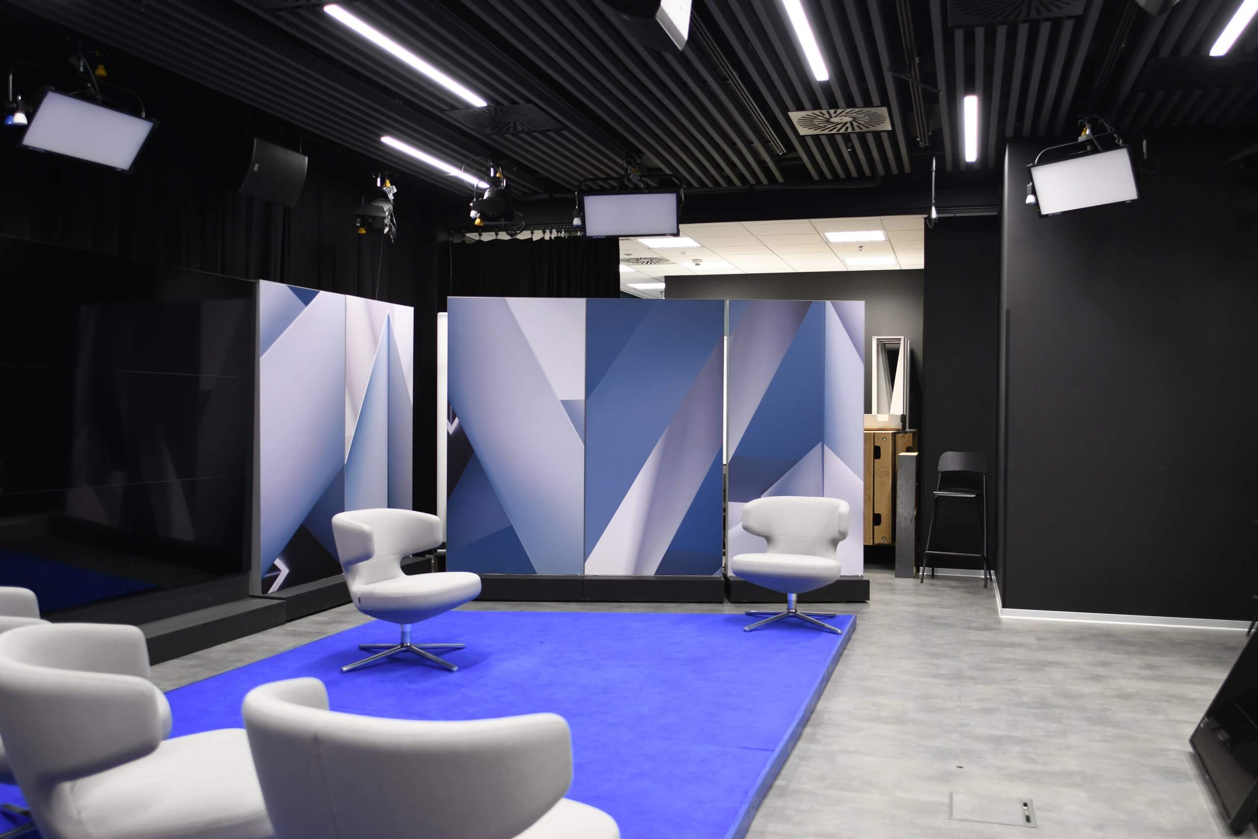 Prostor je rozdělen na dvě natáčecí studia – větší a menší. Větší studio jsme vybavili akustickým podhledem HeartFelt od společnosti Hunter & Douglas, doplněným svítidly vsazenými mezi jednotlivé lamely. Menší studio je vybaveno obdobně, se stropem opatřeným akustickými panely, a navíc zde bylo umístěno plátno pro klíčování obrazu. Tato technická a akustická řešení bylo navrženo s ohledem na funkčnost a moderní design prostor.