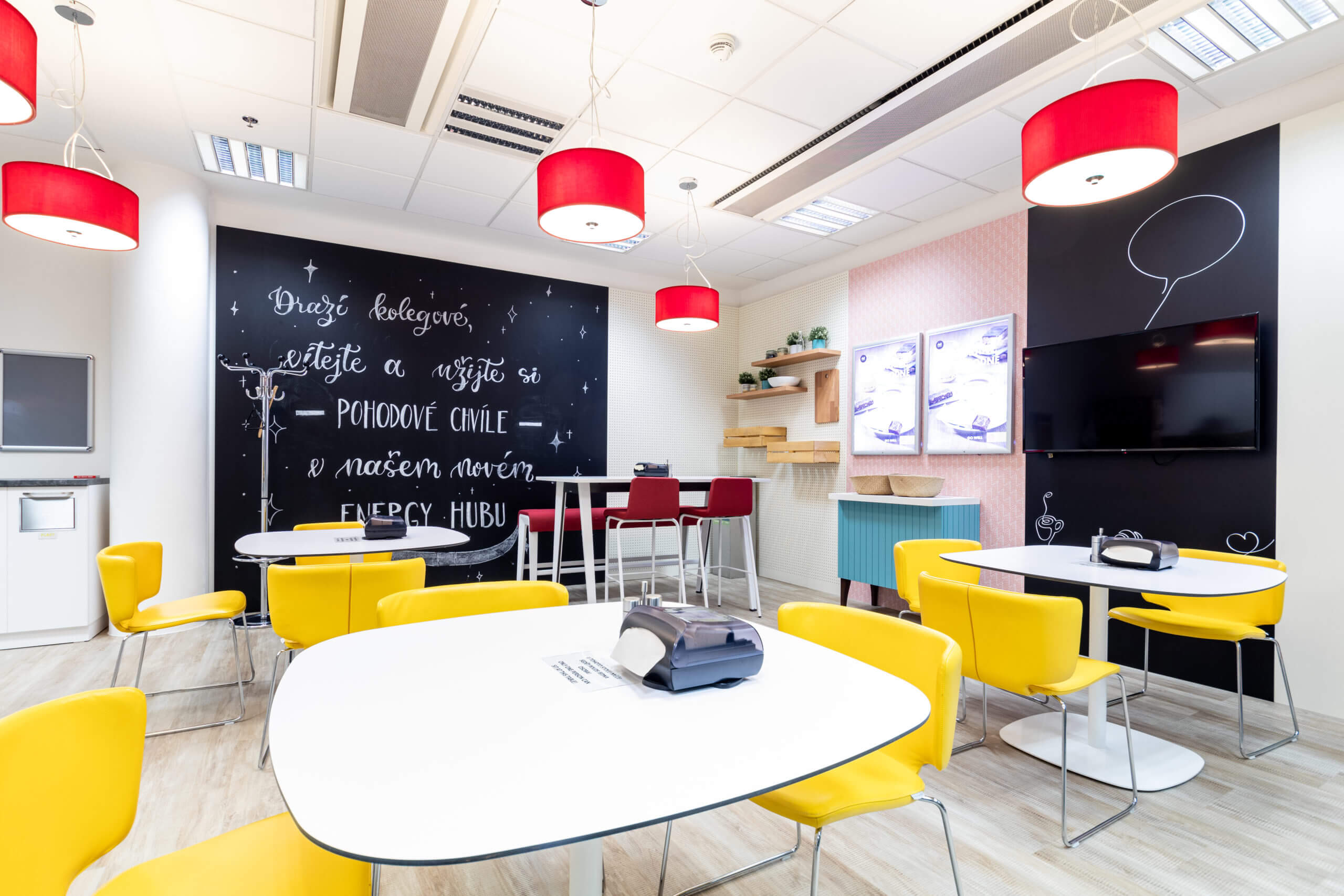 Shell je gigantický nadnárodní koncern. Proto je nutné v kancelářích napříč celým světem dodržovat striktní pravidla ohledně barevnosti, materiálů, nábytku i ergonomie. Zapojili jsme tedy hlavní firemní barvy (červená a žlutá) do vzhledu celého prostoru. Jedná se ale o velmi výrazné odstíny, které by mohly působit někdy až rušivě. Využívali jsme je proto spíš jako doplňkové barvy. K nim jsme v dekorativních prvcích přidali elegantní dřevěné tóny společně s jemnou bílou barvou, což se nejvíce odráží v nové recepci.