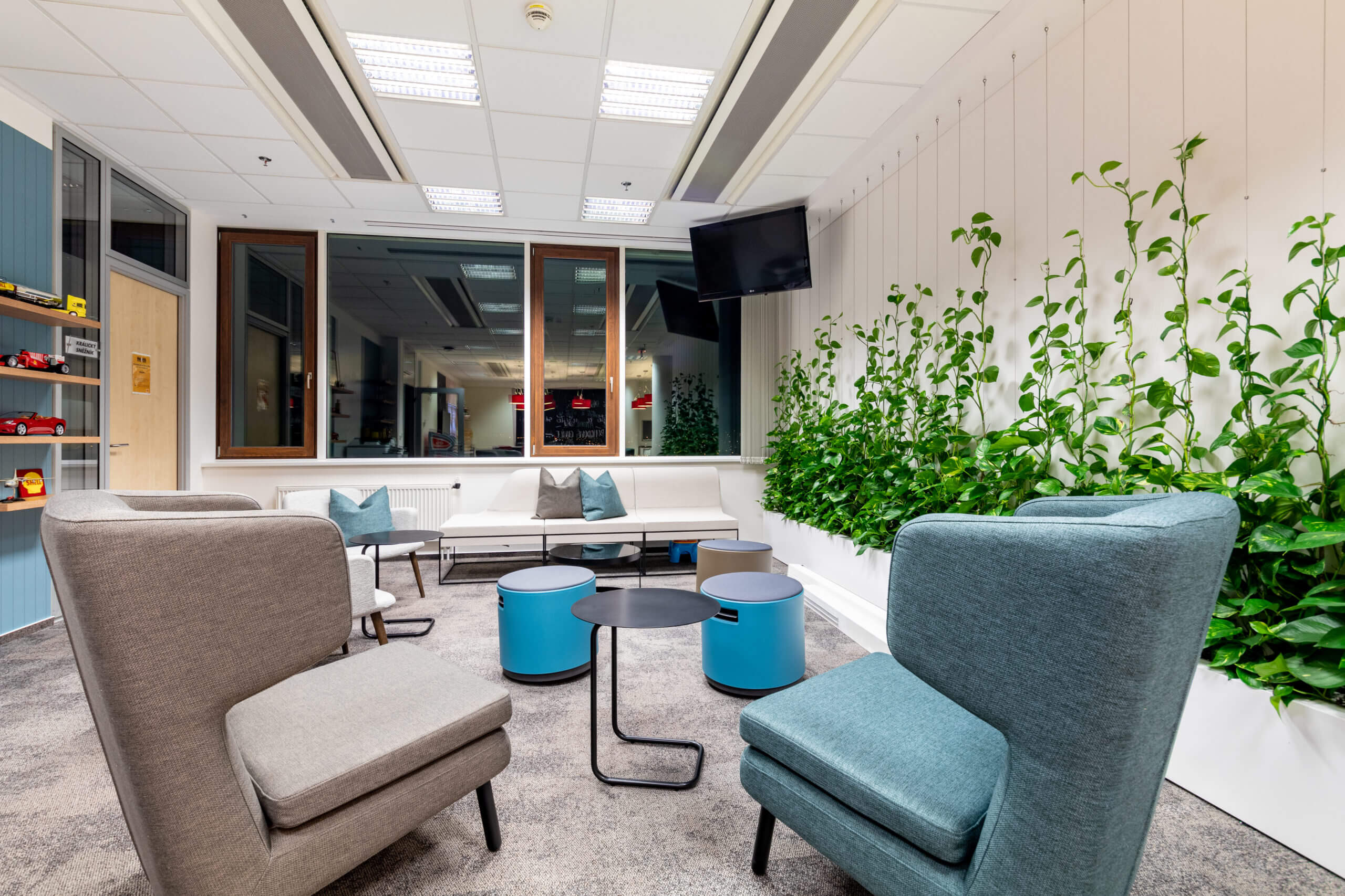Přítomnost rostlin v kanceláři pocitově provzdušňuje celý prostor a působí jako příjemný kontrast k moderním technologickým prvkům. Zeleň jsme umístili do recepce a energy hubu (kuchyňka s relaxační zónou) v podobě krásných zelených stěn. V prostoru recepce slouží tato zelená stěna zároveň jako bariéra mezi vstupem a samotnými kancelářemi.