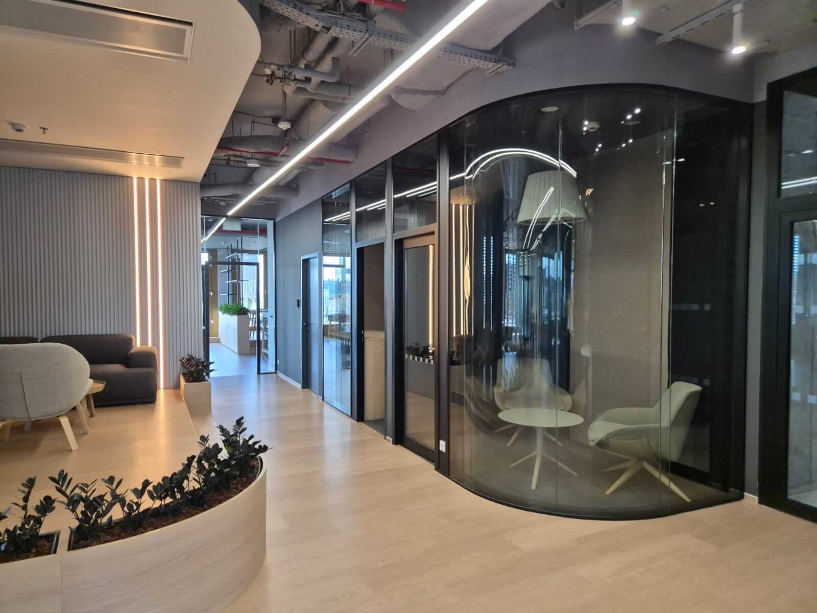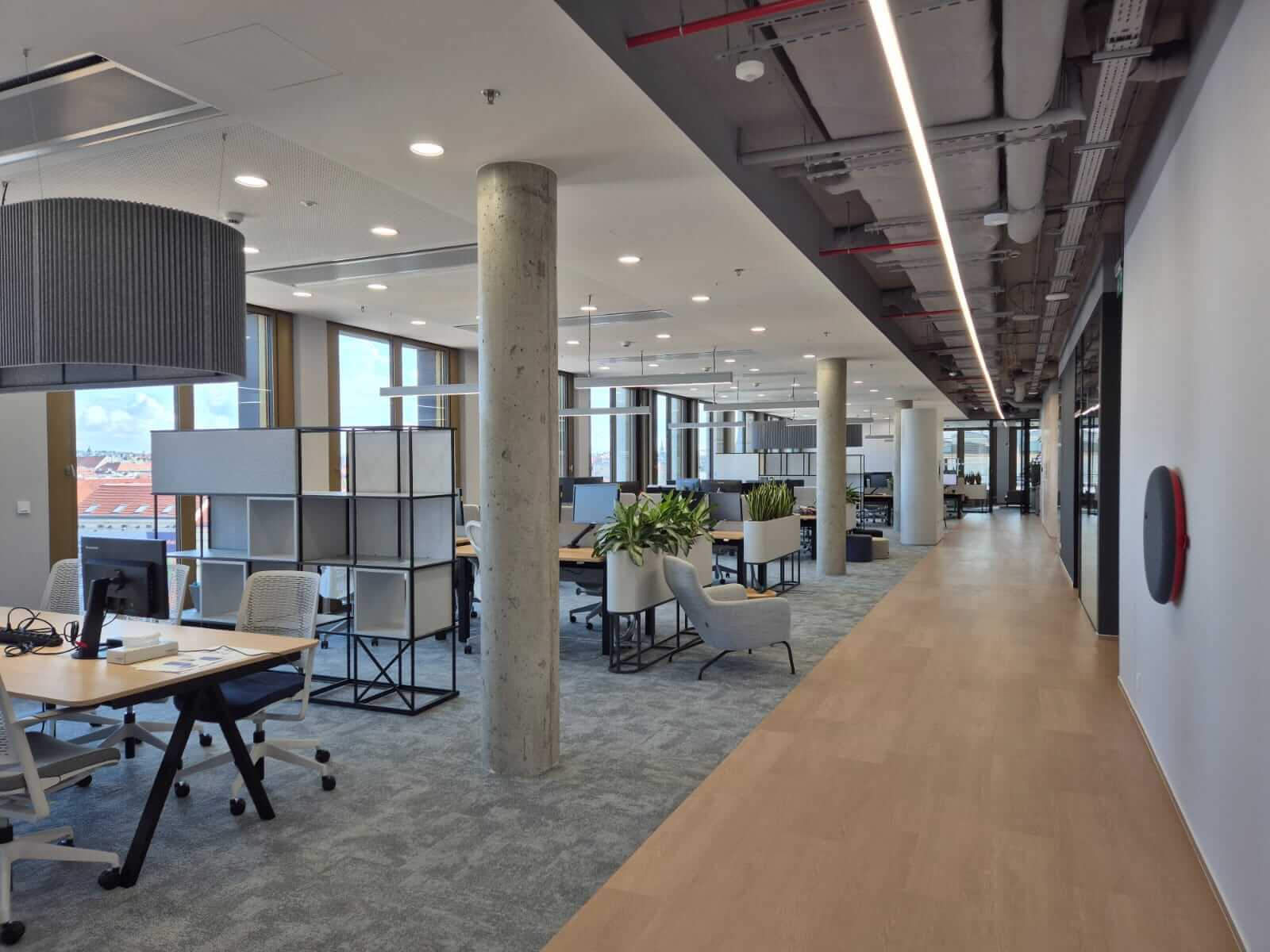 Zajímavým prvkem v kancelářích jsou zaoblené skleněné příčky, které celý prostor provzdušnili a vytvořili neotřelý design. Abychom zaměstnancům zajistili příjemnou akustiku, byly použit moderní akustické podhledy v openspace a akustické panely ve vstupním lobby i zasedacích místnostech. Chodby byly naopak ponechány bez podhledu s viditelnými technologiemi, které dodali prostoru lehce industriální nádech.