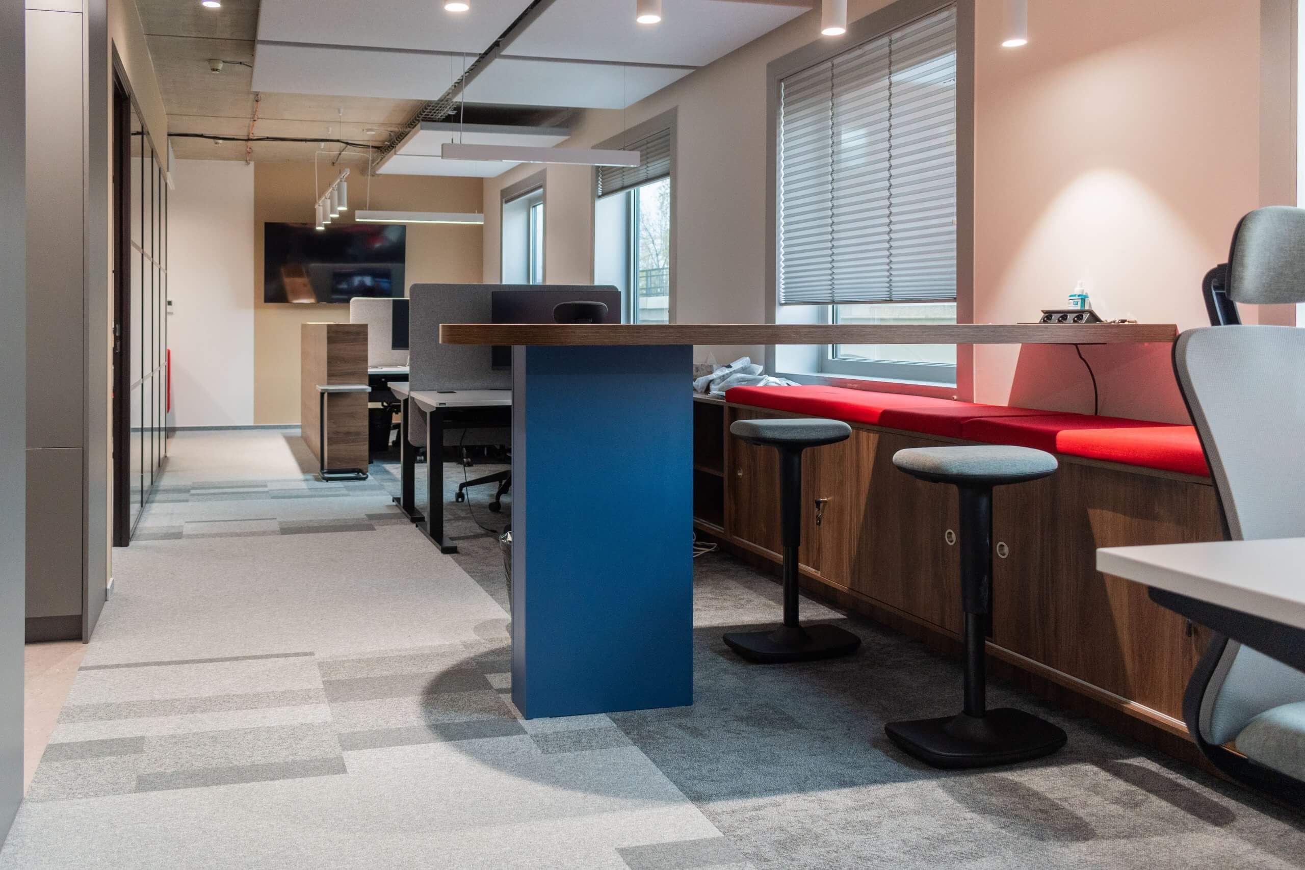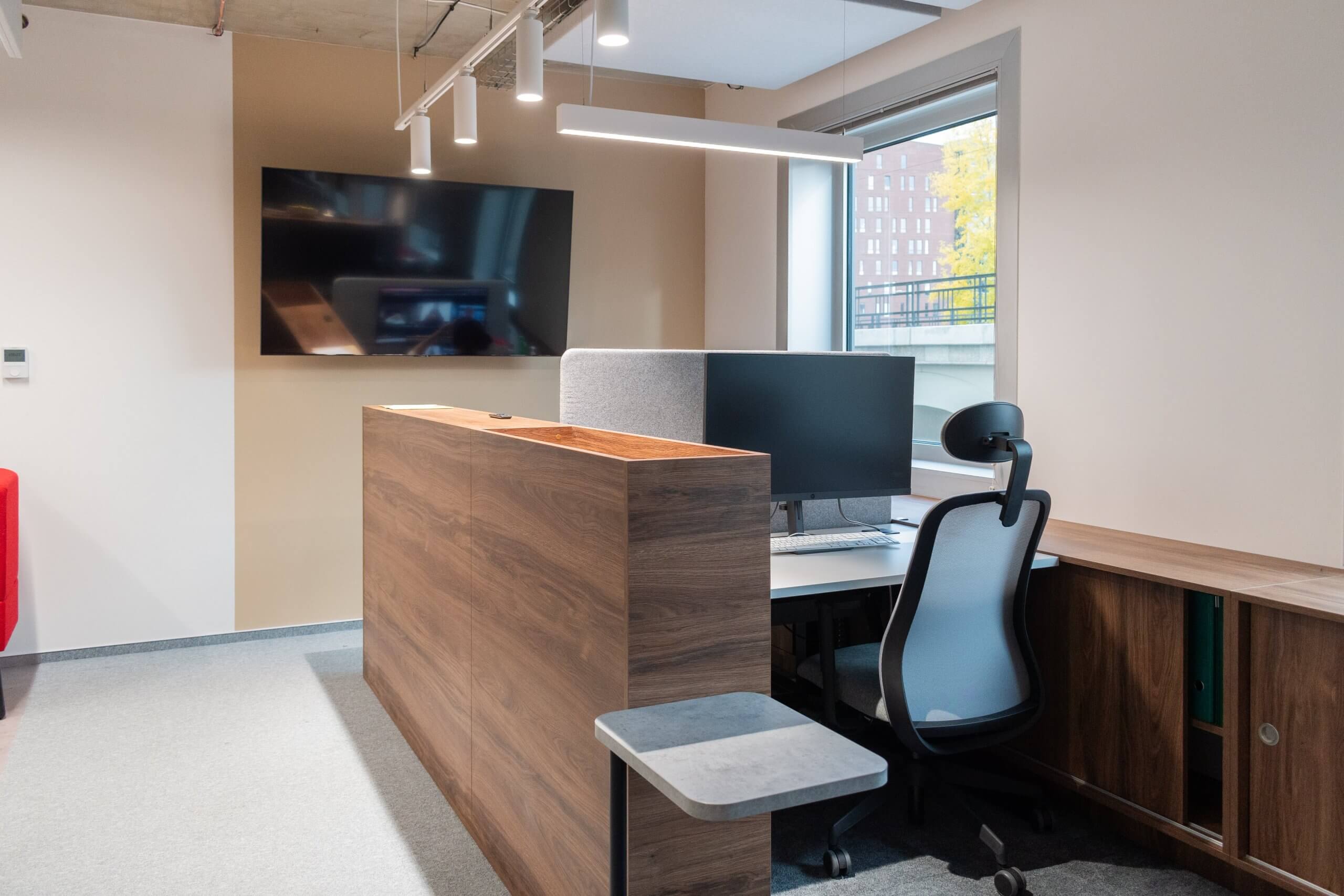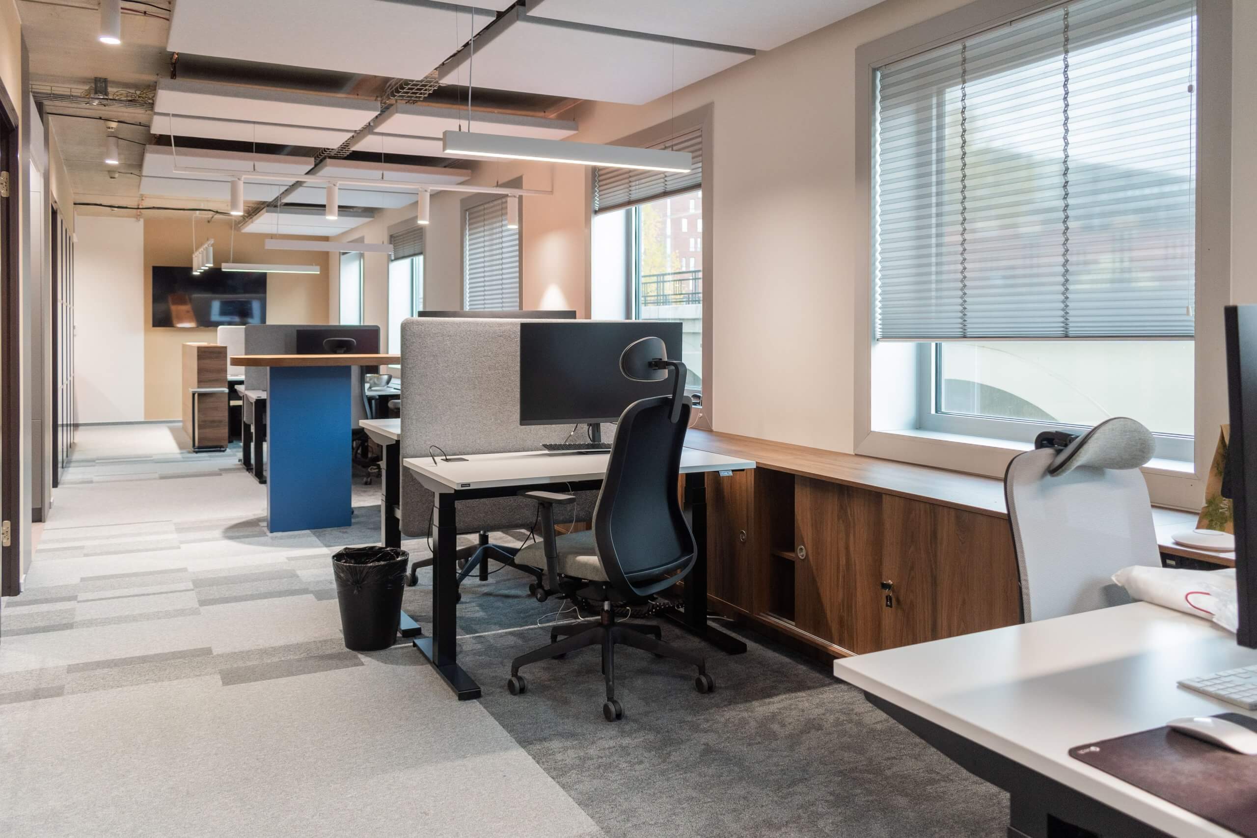 Abychom naplnili klientova očekávání, bylo zapotřebí přistoupit k rozsáhlé rekonstrukci. Stávající dispozice kanceláře byly s ohledem na již vestavěné technologie změněny pouze minimálně, velkých změn ale doznaly například podlahy, které byly opatřeny novou krytinou. Společně s podlahami jsme přistoupili i k úpravě stropu, který jsme opatřili novými podhledy. Nezapomněli jsme ani na akustiku, kterou jsme vylepšili novými akustickými panely přímo nad pracovními místy.
