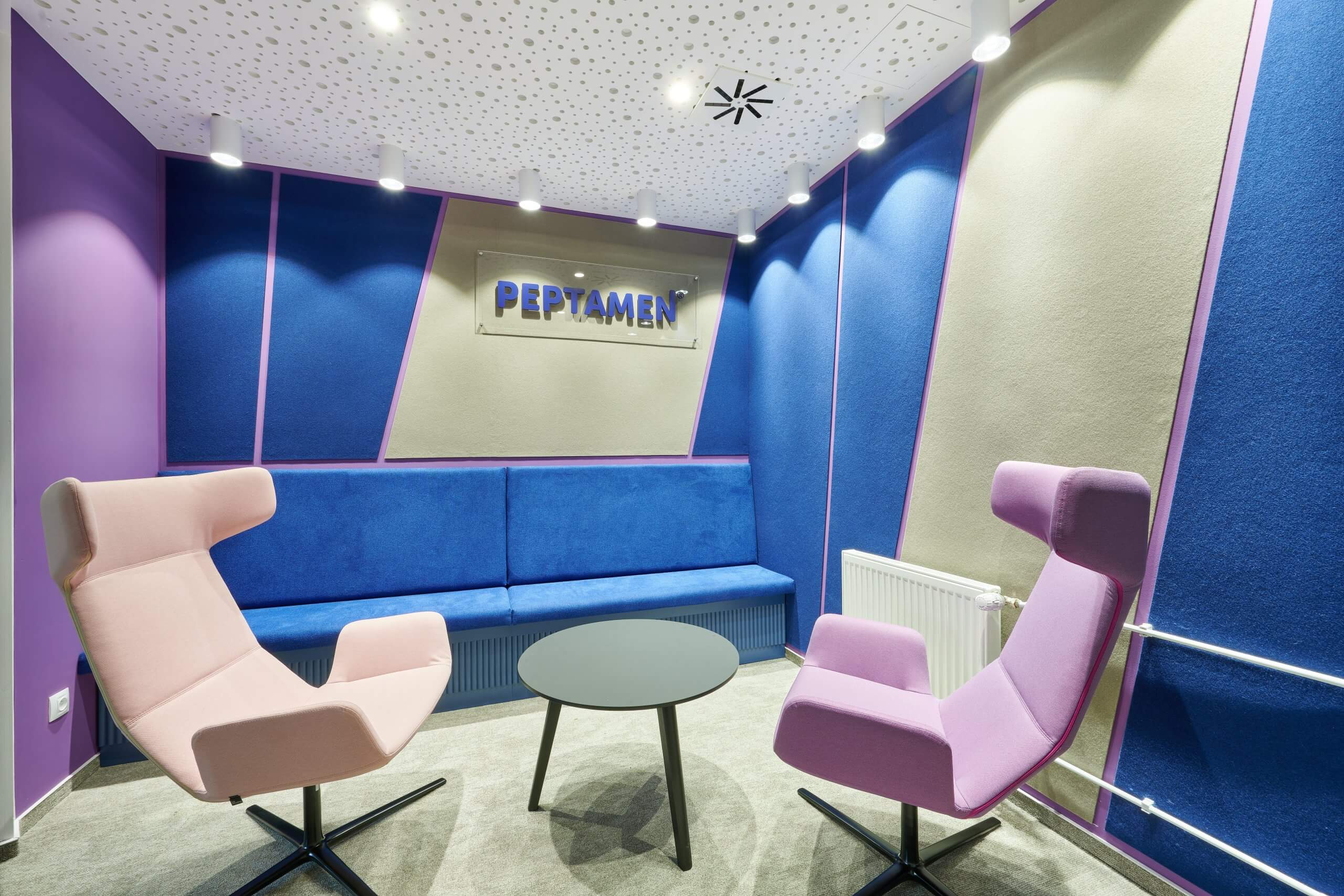 Bezmála jeden kilometr čtvereční kancelářských ploch, které v pražských Průhonicích využívá farmaceutická společnost MUCOS Pharma CZ, která je součástí spol. Nestlé Health Science a je vedoucím světovým producentem kombinovaných enzymových preparátů pro systémovou enzymoterapii, byl naší další velkou výzvou. Naší úlohou bylo mimo jiné dodání veškerého interiérového vybavení – kancelářského nábytku, vybavení zasedací místnosti, kuchyňské sestavy nebo nábytku v prostorách recepce.