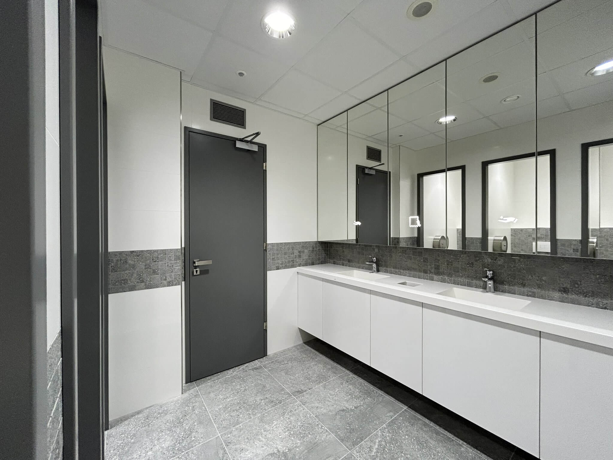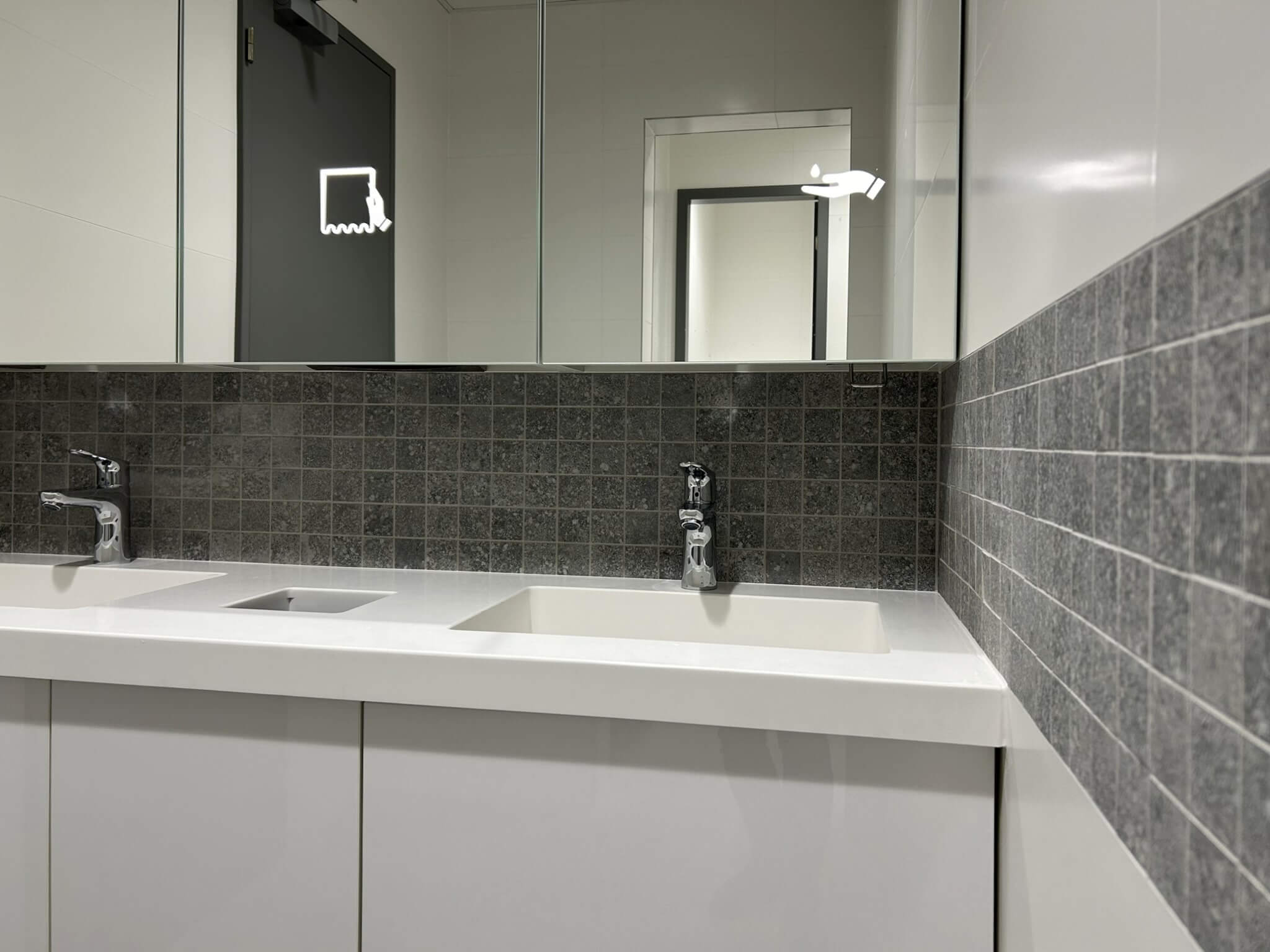 Jednou z dominant prostor toalet je zrcadlová stěna nad umyvadly, která v sobě ukrývá dávkovače mýdla a papírových ručníků. Obojí je elegantně označeno podsvícenými piktogramy přímo v zrcadle, což zajišťuje jejich snadnou viditelnost. Dalším výrazným prvkem jsou atypická umyvadla vyrobená z umělého kamene Corian. Umyvadlová deska je navíc opatřena otvory pro vhoz použitých papírových ručníků, což přispívá k čistotě a snadné údržbě prostoru. Pro zachování komfortu a bezpečí osob s omezenou pohyblivostí jsme věnovali zvláštní pozornost také bezbariérové úpravě toalet.