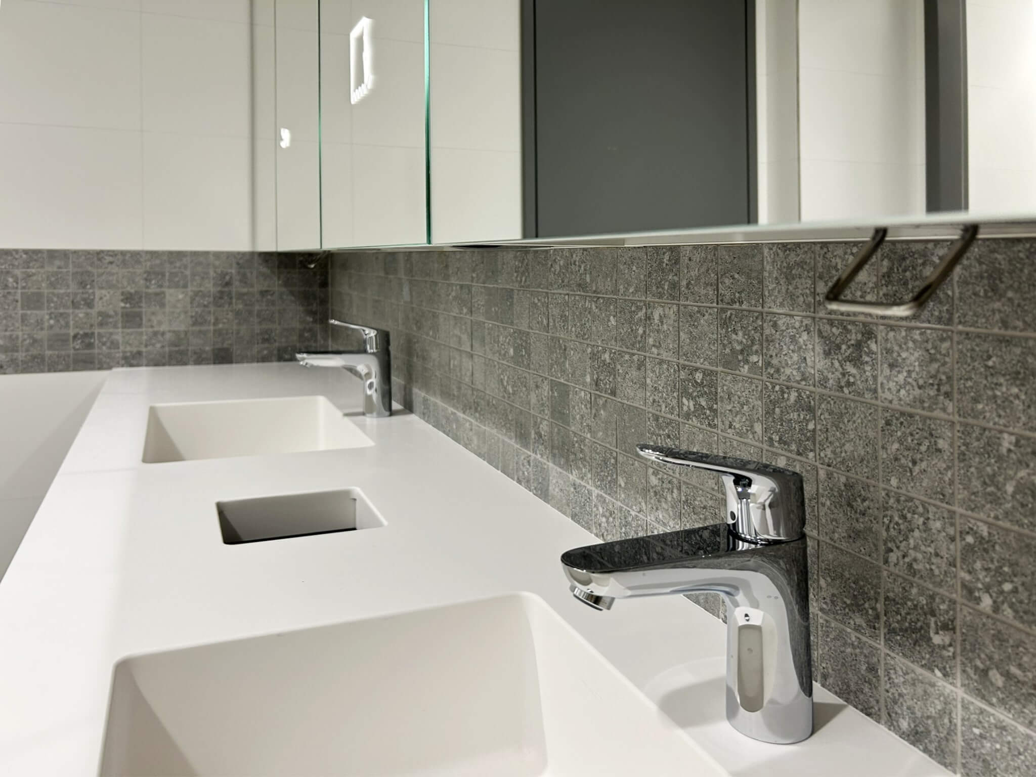 I ve druhé etapě jsme se zaměřili především na kombinaci velkoformátového obkladu s mozaikou, pokládku dlažby a instalaci moderních zařizovacích předmětů. Naší dodávkou byly i dveře barevně korespondující s mozaikou, čímž jsme docílili jednotného vzhledu prostoru. Na základě pozitivní zpětné vazby z předchozí realizace jsme opět využili osvědčené typy materiálů, které klient i zaměstnanci hodnotí jako praktické a odolné.