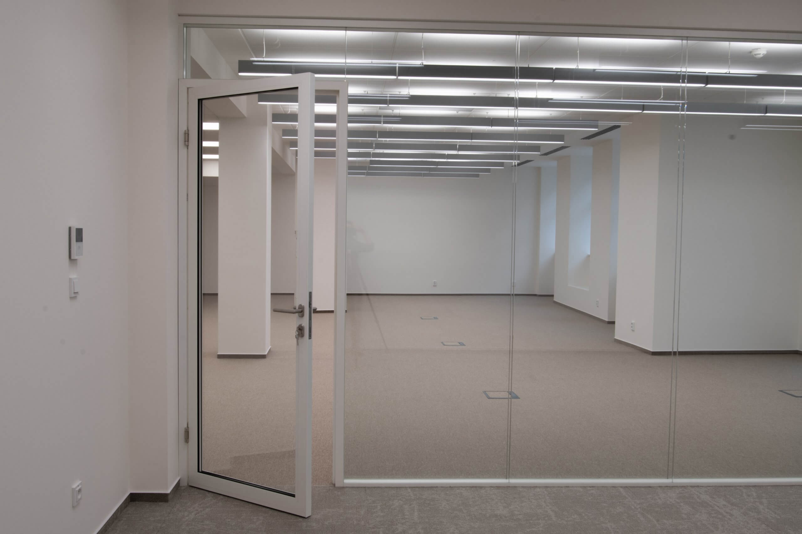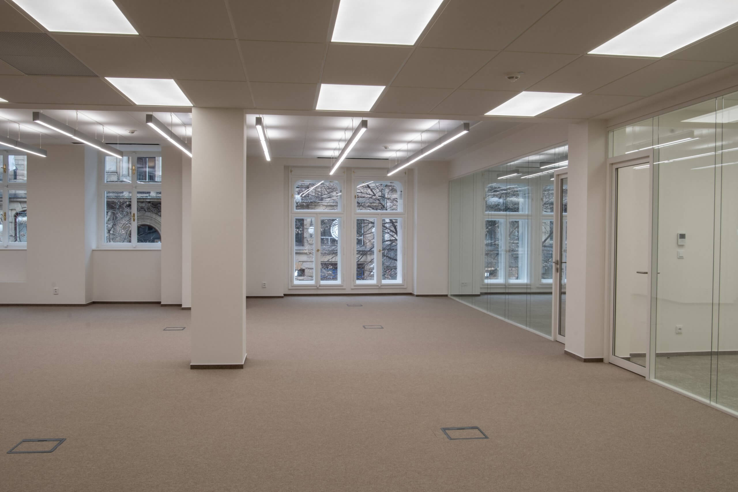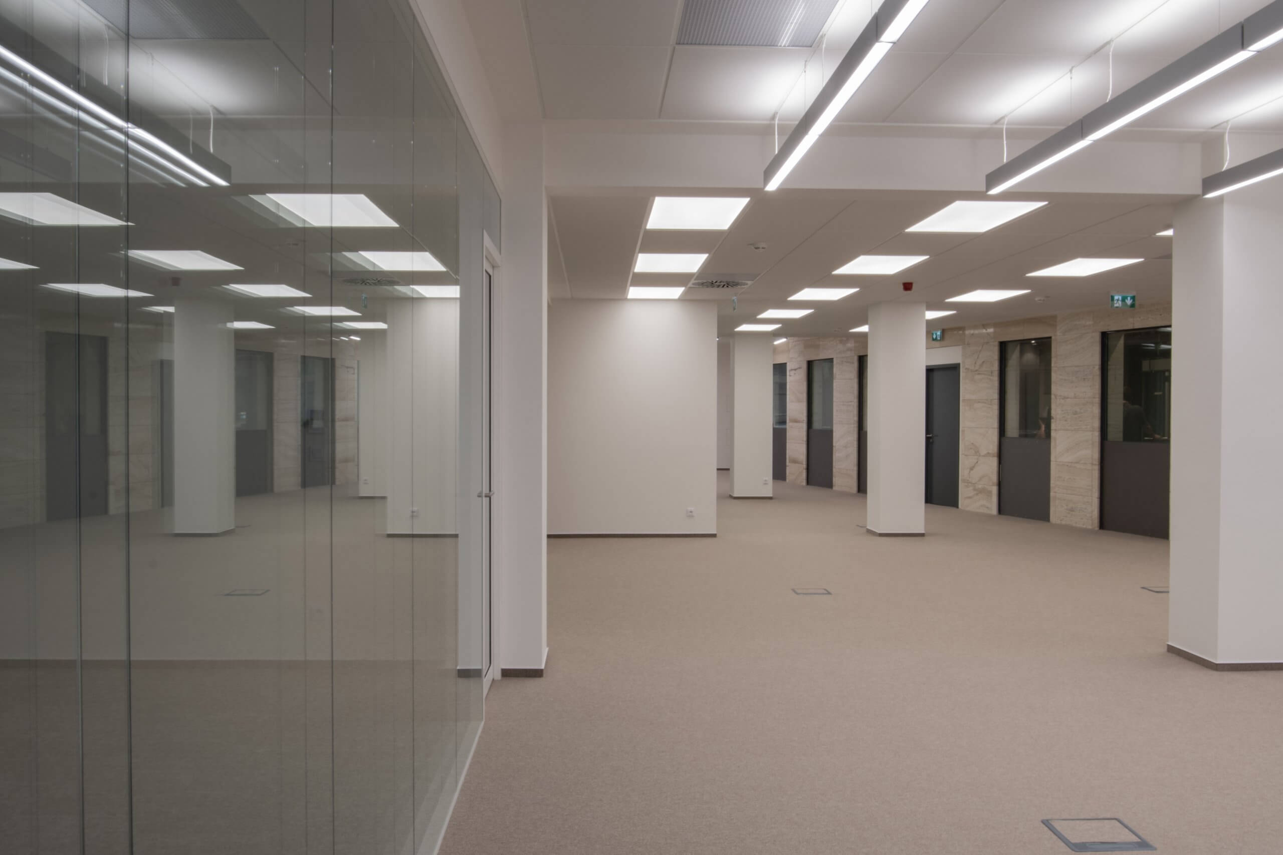 Jednou z klíčových součástí projektu bylo vytvoření dvou menších openspace prostor. Ty jsme vybavili lineárními svítidly s dvojitým osvětlením – směřujícím dolů na pracovní plochu i nahoru pro ambientní efekt. Sociální zázemí jsme vytvořili kompletně nové dle zadání klienta. Prostor jsme doplnili zasedacími místnostmi oddělenými elegantními prosklenými příčkami od společnosti Verti. Podlahové krytiny byly vybrány standardní pro kancelářské prostory, tedy kombinace kobercových čtverců a vinylových dílců v okolí kuchyňky.