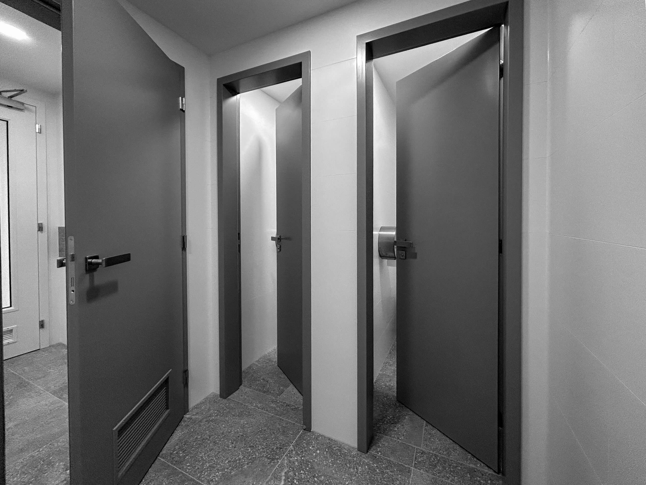 Design v této realizaci vychází ze stejného konceptu jako v předchozím projektu. Instalovali jsme šedé lakované dveře s klikami M&T, které jsou sladěny s dlažbou na podlaze v imitaci antracitovo šedého kamene. Tento dekor jsme použili i ve formě mozaiky na stěnách, čímž jsme docílili vizuální jednotnosti prostoru. Na stěny jsme opět zvolili bílý obklad ve formátu 60×30 cm, který pomáhá opticky prosvětlit interiér.