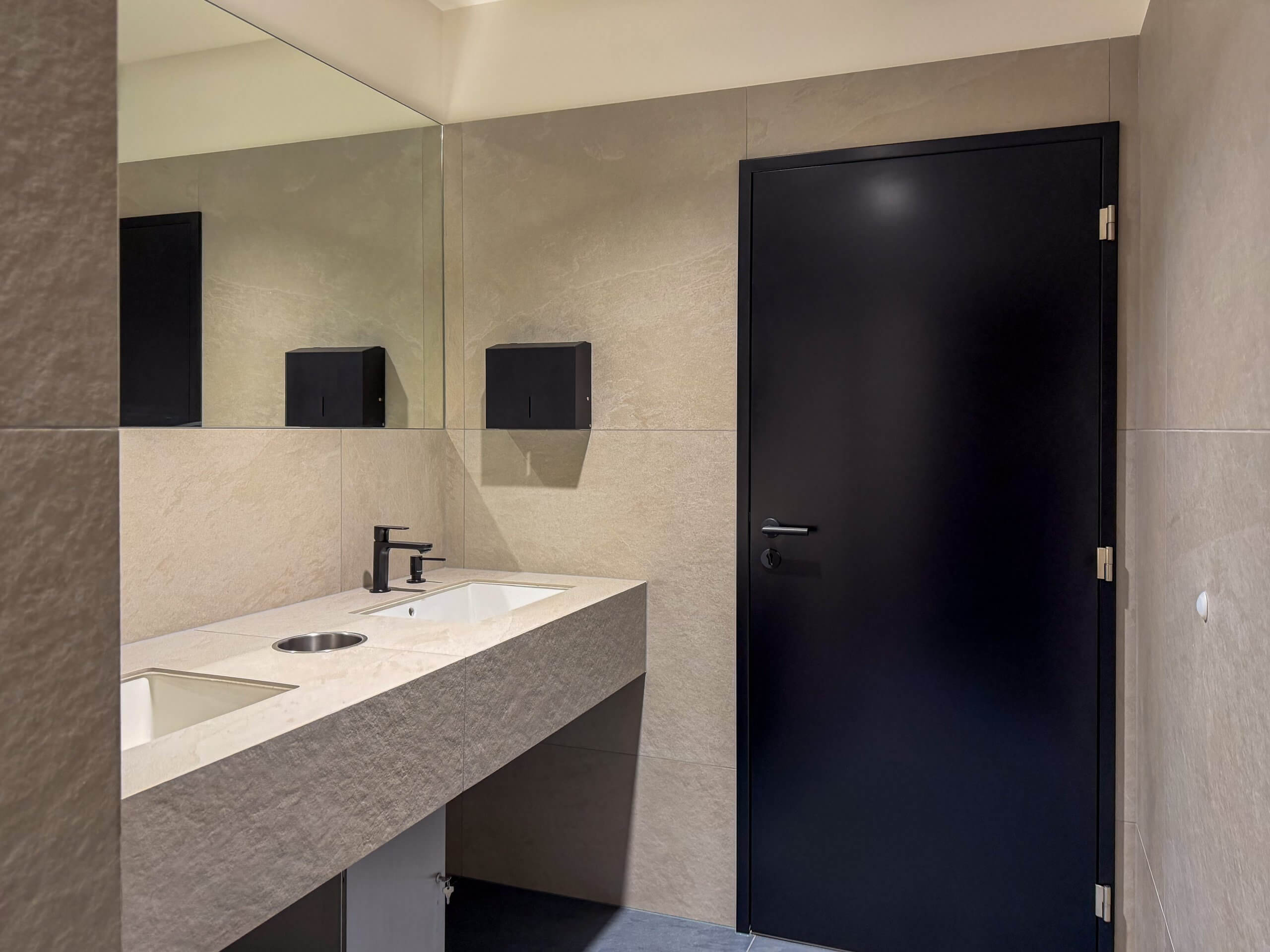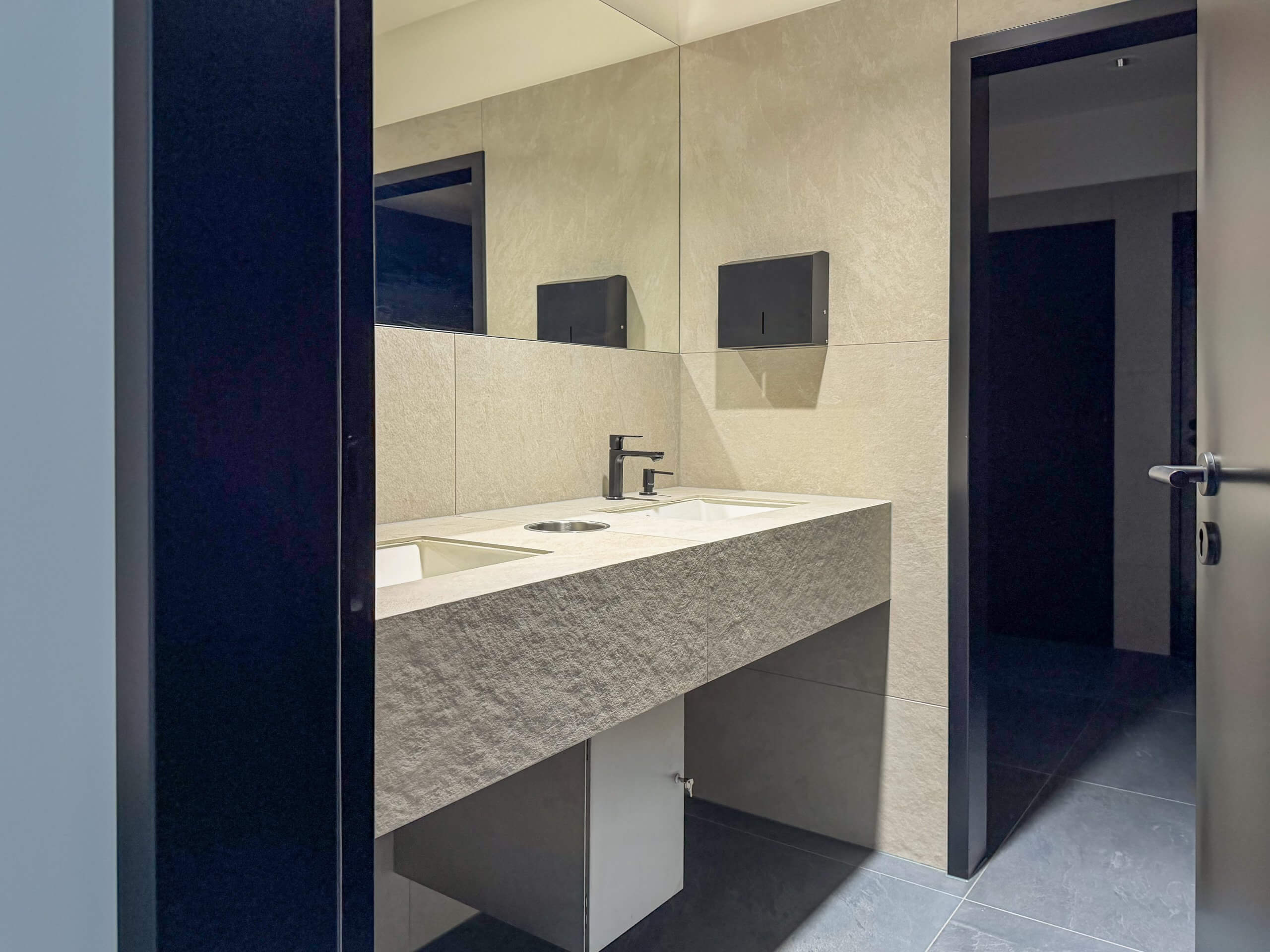 Umyvadlová deska je obložena stejným materiálem jako stěny a plynule na ně navazuje. Zrcadlo je vloženo přímo do obkladu, což dále podporuje minimalistický charakter prostoru. Zapuštěná umyvadla, integrované dávkovače mýdla i baterie a koš na použité papírové ručníky skrytý v umyvadlové desce přispívají k maximální čistotě řešení. Veškeré zařizovací předměty jsou navrženy v černé barvě, která interiéru dodává jemný kontrast a podtrhuje jeho elegantní výraz.