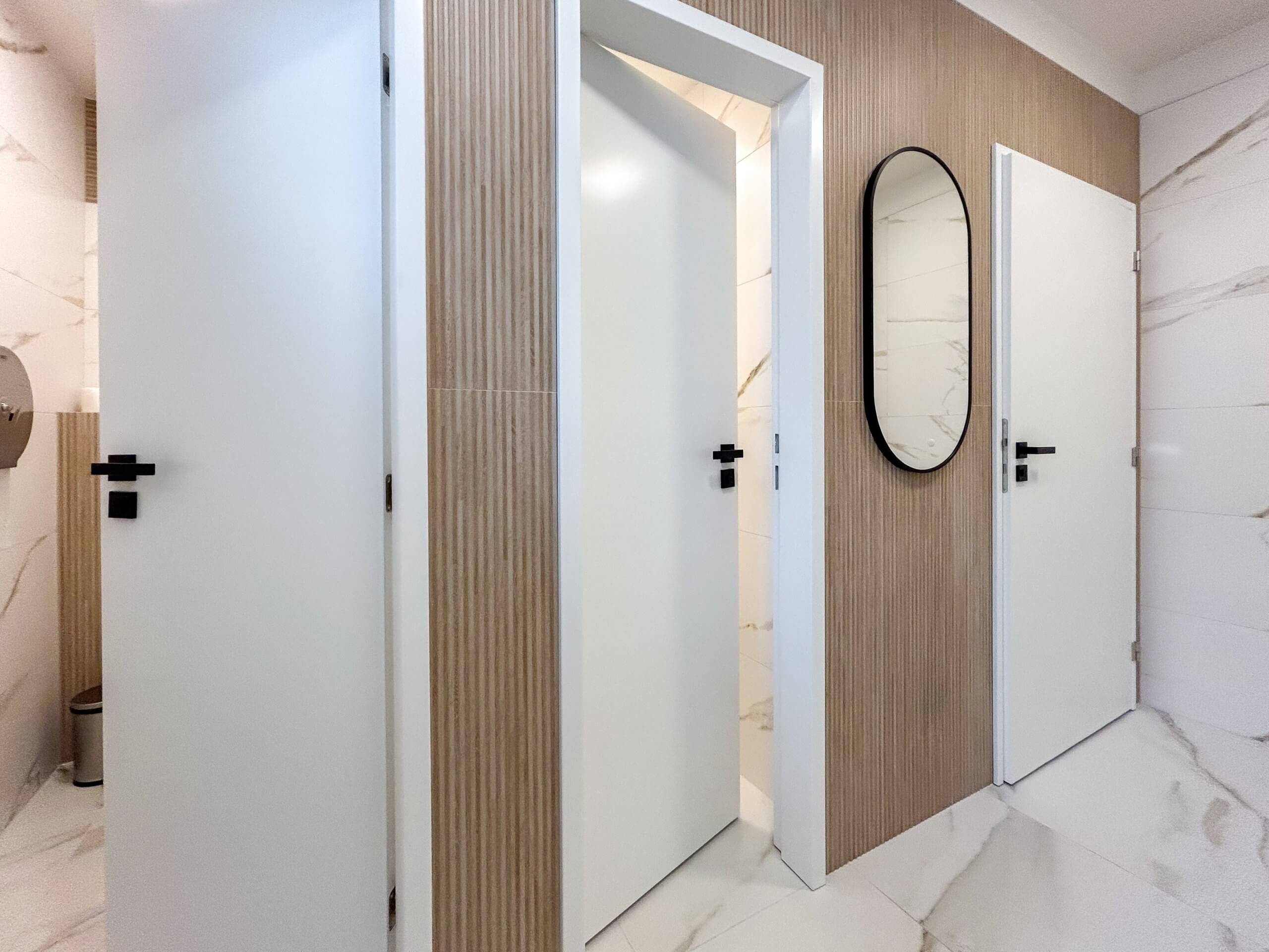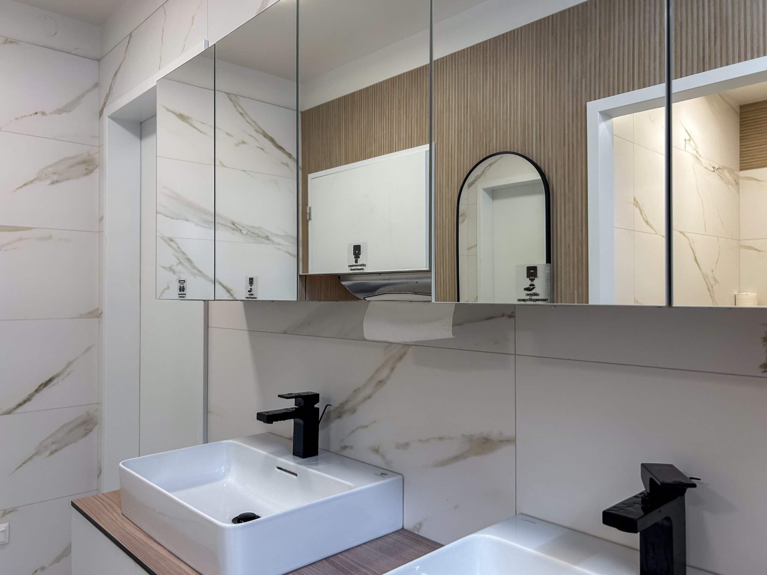 Součástí realizace byly také truhlářské prvky zhotovené na míru. Dodali jsme umyvadlovou skříňku a zrcadlovou skříňku nad umyvadly, ve které je nainstalováno veškeré potřebné vybavení – dávkovače mýdla, osoušeče rukou i zásobníky na papírové utěrky. Díky tomuto řešení působí toalety čistě a esteticky, přičemž si zachovávají svou plnou funkčnost a praktičnost.